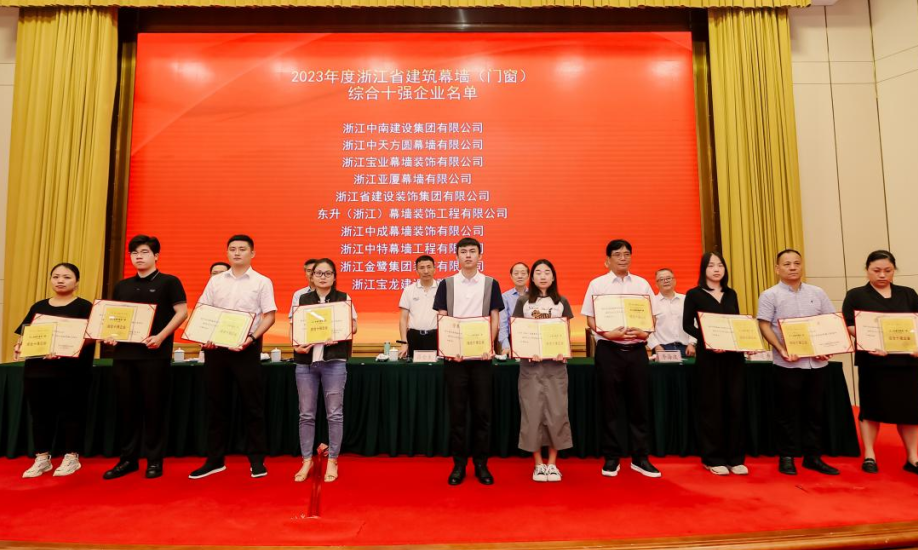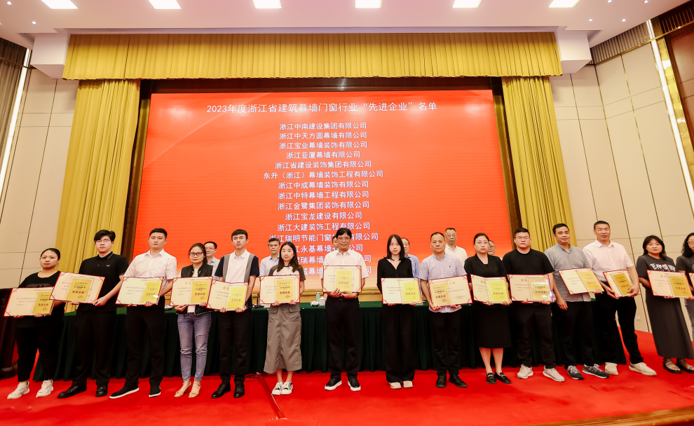 会上会长助理朱双珠宣读了金刚奖浙江推荐奖、优秀建造师的表彰文件,副秘书长胡新赞宣读了双十强企业、先进企业、BIM技能应用大赛的表彰文件,金鹭装饰荣获2023年度浙江省建筑幕墙门窗行业“先进企业”、2023年度浙江省建筑幕墙门窗综合“十强企业”两项荣誉。